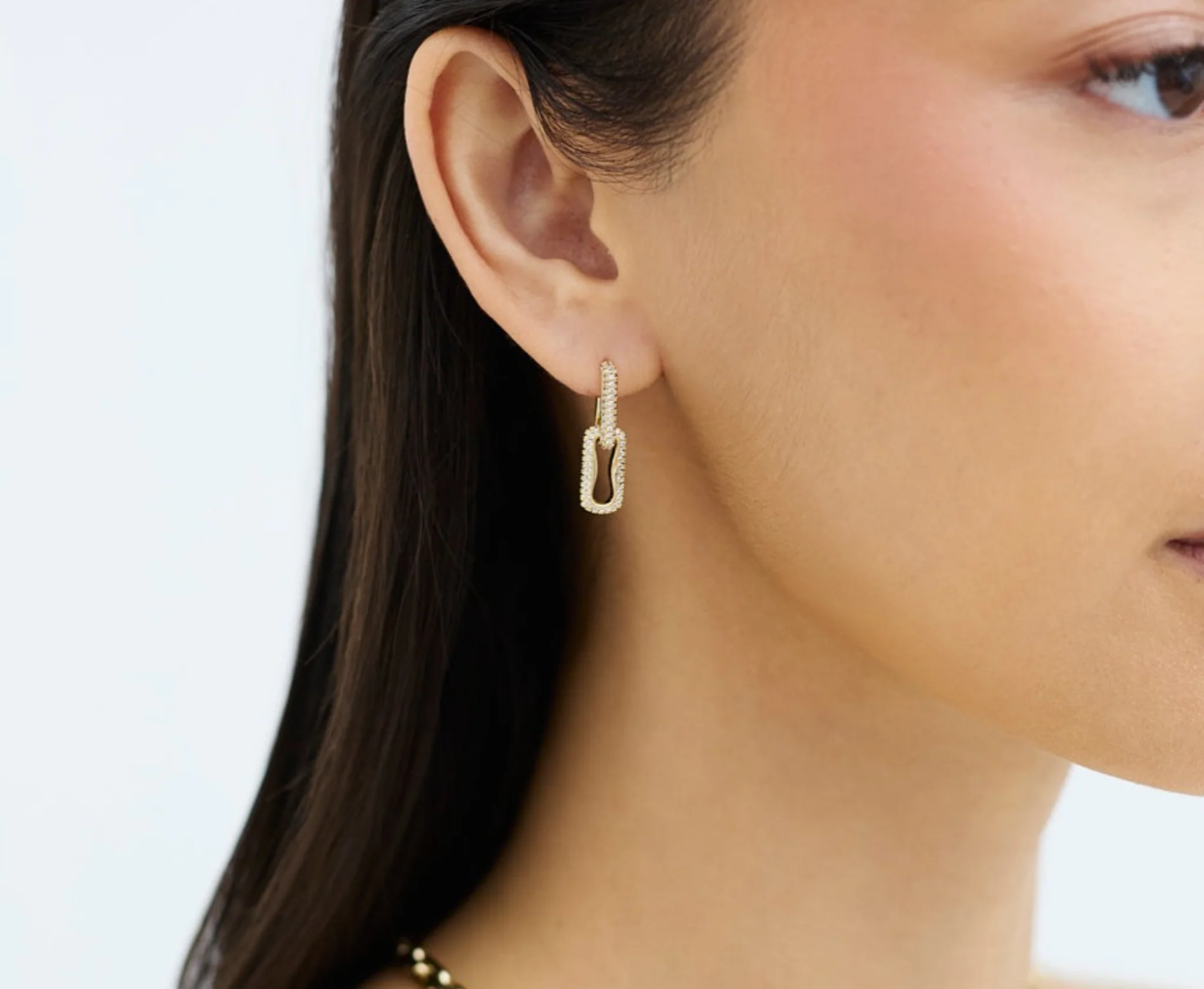 Elevate your look with The Pavé Paperclip Drop Earrings. These pave drop earrings feature a unique indented paperclip design in gold or silver, perfect for layering and adding subtle sparkle.